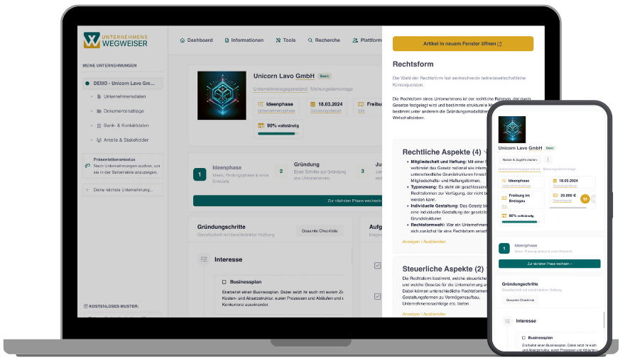 Von der ersten Idee bis zur formellen Unternehmensgründung – der Unternehmenswegweiser begleitet dich bei jedem Schritt. Ob bei der Namensfindung, der optimalen Rechtsform und allen relevanten Schritten in deinem Gründungsprozess, wir stehen dir mit unseren intelligenten Tools und der Wegweiser-AI zur Seite.